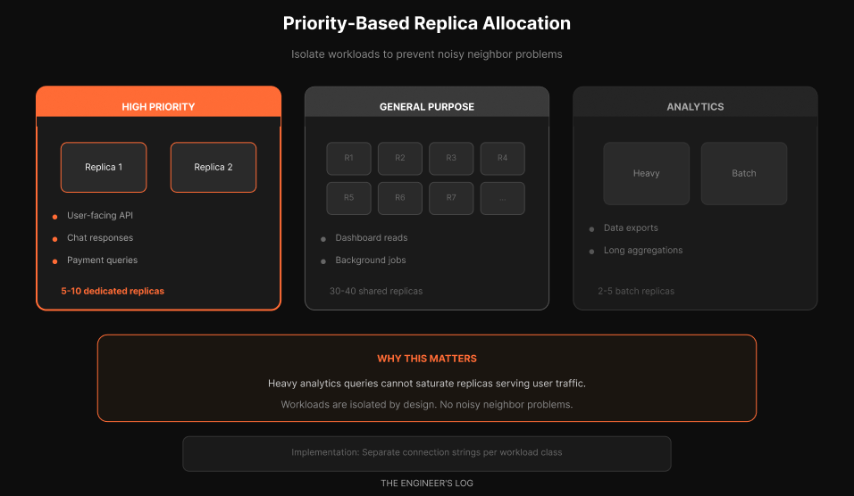 Exceptional deep dive into replica strategies. The workload isolation pattern with dedicated replica pools is probaly the most underrated scaling technique because most teams just add replicas without thinking about noisy neighbour problems. I've seen analytics queries crush user-facing traffic countless times before we seperated them. The 9 production rules section is gold, especially the prepared statements trap with PgBouncer in transaction mode.