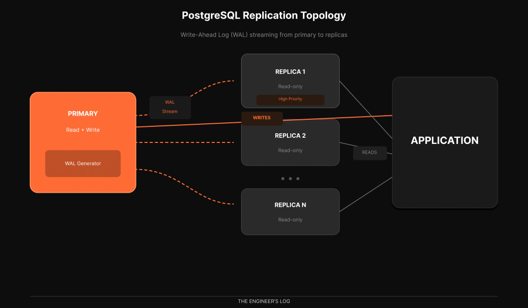 PostgreSQL replication works through the Write-Ahead Log, or WAL. Every change to your database gets written to the WAL before it is applied to the actual data files. This is how Postgres guarantees durability. If the server crashes, it can replay the WAL to recover [3].