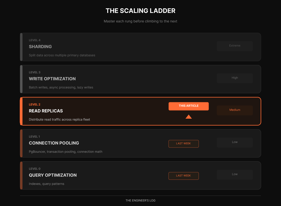 This article focuses entirely on Level 2. We will go deep on read replicas. Not the surface-level advice of “add a replica and route reads,” but the actual decisions, tradeoffs, and gotchas that determine whether your replica strategy helps or creates new problems.