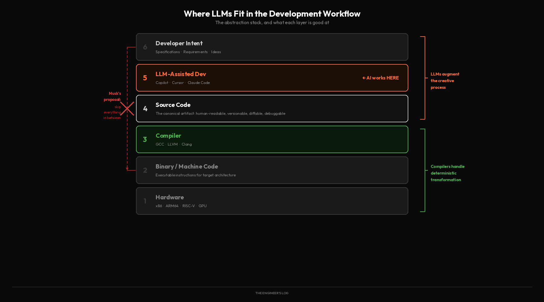 There’s a technical term for what’s happening here, and it’s not “innovation.” It’s a category error. A compiler is a semantics-preserving transformer: it operates on a formal language with a specification, and its output is checkable against that specification. An LLM is an inference engine that produces plausible continuations of token sequences with no inherent correctness guarantee. Musk is proposing we replace the former with the latter. To understand why this falls apart, you need to understand what compilers actually do.