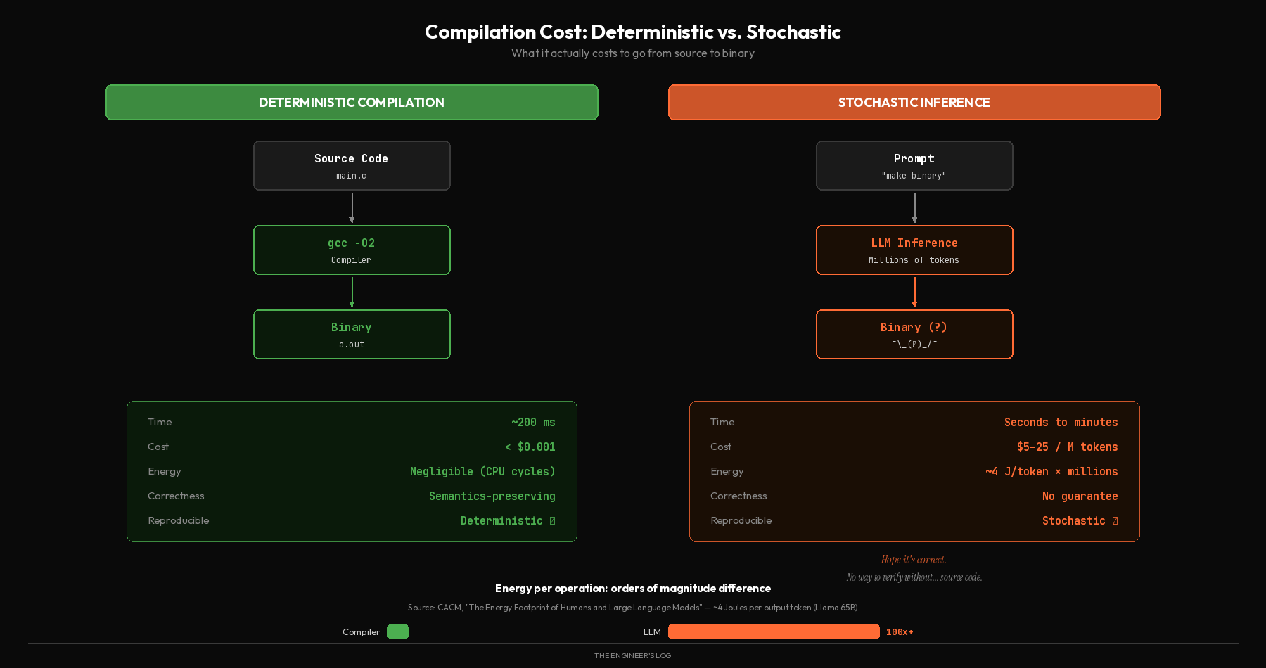 Even if we’re generous and assume an LLM could somehow produce correct binary output (which it cannot, but we’ll get to that), the energy economics alone are damning. Measurements with Llama 65B report around 4 Joules per output token. A modest binary might require generating millions of tokens. Meanwhile, a deterministic compiler converts the same source code to the same binary using a few hundred CPU cycles per instruction, consuming orders of magnitude less energy.