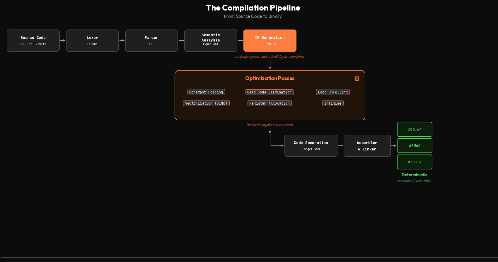 After that, the compiler translates your code into an intermediate representation (IR). In LLVM, this is a typed, SSA-based format that’s independent of both the source language and the target hardware. This is the keystone of the whole architecture. Rust, Swift, C, C++, Julia, Zig, all compile down to the same IR. And once they’re there, the same optimization passes apply to all of them.
